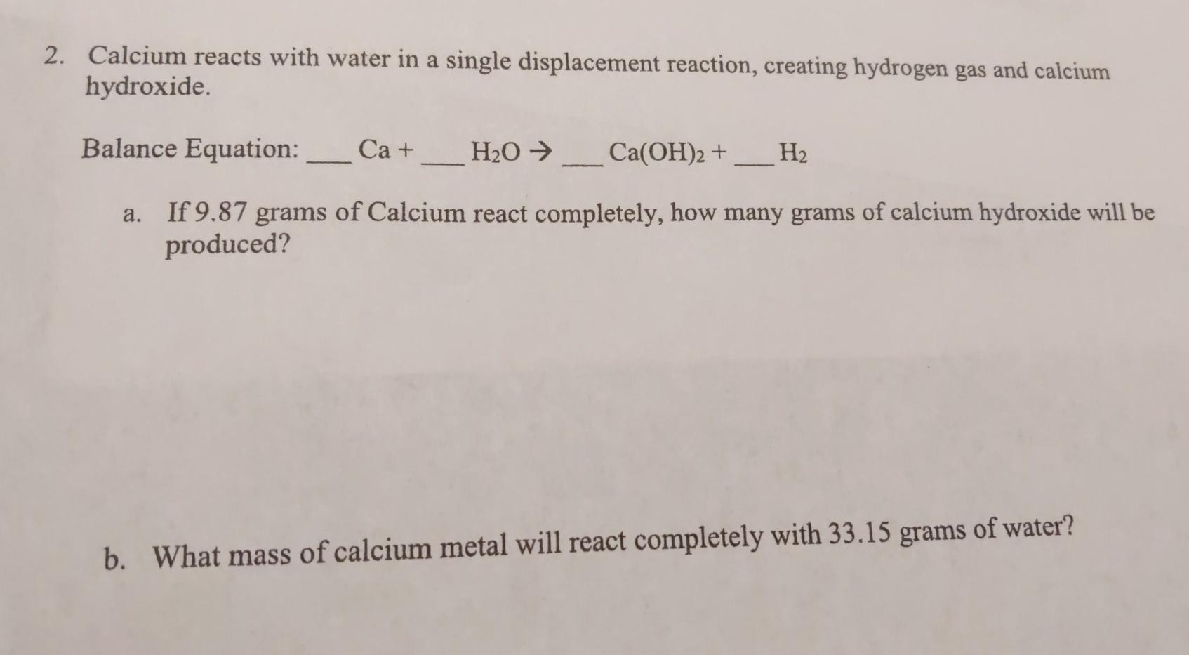 Solved 2 Calcium Reacts With Water In A Single Displacement Chegg Com